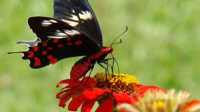 Le biomimétisme est peut-être une fois de plus l’une des clés du développement d’énergies renouvelables plus performantes. En étudiant le papillon Pachliopta aristolochiae, des chercheurs de l’Institut de technologie de Karlsruhe (Allemagne) ont développé un nouveau type de cellule solaire basée sur les nanostructures des ailes noires de l’insecte qui ont la particularité de très bien absorber la lumière du soleil.