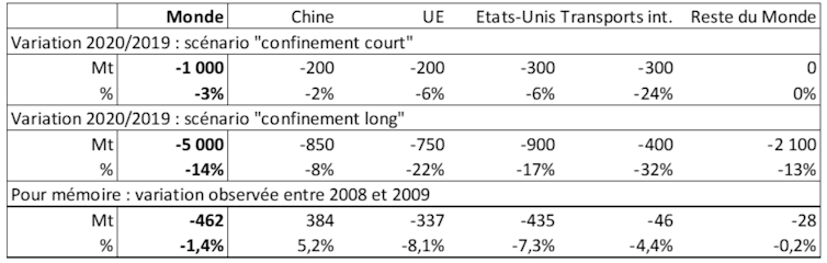 Le scénario le plus probable est désormais celui d’une sortie plus étalée dans le temps du confinement. La Chine, les États-UnisÉtats-Unis et l’Europe connaîtraient alors des baisses d’émission situées entre 700 et 900 Mt. Avec un recul de plus de 2 Gt, le reste du monde serait le plus gros contributeur au repli. Au total, le monde se dirigerait vers une chute des émissions de l’ordre de 5 Gt (-14 %). Ce chiffre se situe un peu au-dessus des estimations recensées par le site d’information Carbon Brief.