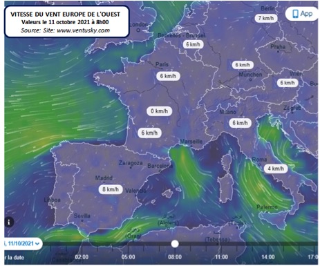 Contrairement au poncif vert : Quand il n’y a pas de vent ici, etc…, la carte des vents sur l’Europe de l’ouest ci-dessous, montre que le 11 octobre à 8h00 (jour de la rédaction), en aucun point, de Séville à Berlin, la vitesse du vent n’était suffisante pour faire démarrer une éolienne (10 km/h et production nominale de 50 à 90 km/h).