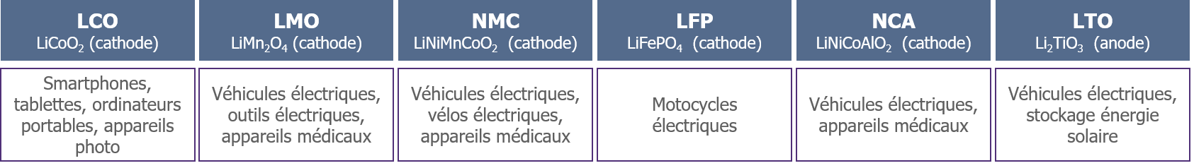 Les 6 principaux types d’accumulateurs lithium-ion, la formule chimique de la technologie (qui correspond souvent à la composition de la cathode) et leurs applications sont résumés ci-dessous :
