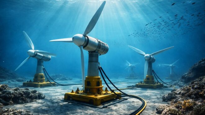 L’hydrolien fonctionne selon un principe proche de l’éolien, mais sous l’eau. Des turbines sont installées sur les fonds marins afin de capter l’énergie produite par les courants et les marées.
