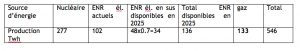 Les accroissements prévus de productions électrique éolienne et photovoltaïque correspondent à peu près à ceux de la loi pluriannuelle de programmation énergétique (PPE) de 2016. Les productions annuelles de l’éolien et du photovoltaïque atteindront en 2025 environ respectivement 60 Twh et 20 Twh, correspondant à un rythme d’accroissement de capacité de 5Twh/an chaque année et à un accroissement global de 48 Twh/an. Il apparaît alors de façon évidente que les ENR ne pourront combler le déficit et qu’il faudra produire de l’électricité avec des énergies fossiles, la moins pire sur le plan écologique étant le gaz. Les résultats sont indiqués dans le tableau suivant :