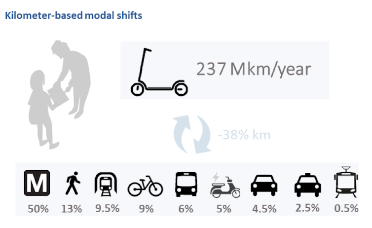 D’abord, les reports modaux kilométriques ont été estimés sur la base d’une enquête spécifique conduite dans les rues parisiennes à l’été 2019 : deux tiers provenaient du métro et du RER, un quart du vélo et de la marche. Seuls 7 % des kilomètres parcourus en trottinettes ont remplacé la voiture (personnelle ou taxi). Malgré 8 % de déplacements induits, les déplacements parisiens ont diminué de 150 millions de kilomètres sur un an, grâce aux trajets plus directs en trottinette.