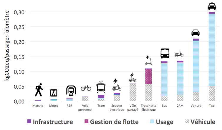 Selon ces travaux, une trottinette électrique partagée générerait dans ce pays autour de 130 grammes de CO2 équivalent par personne et par kilomètre parcouru.